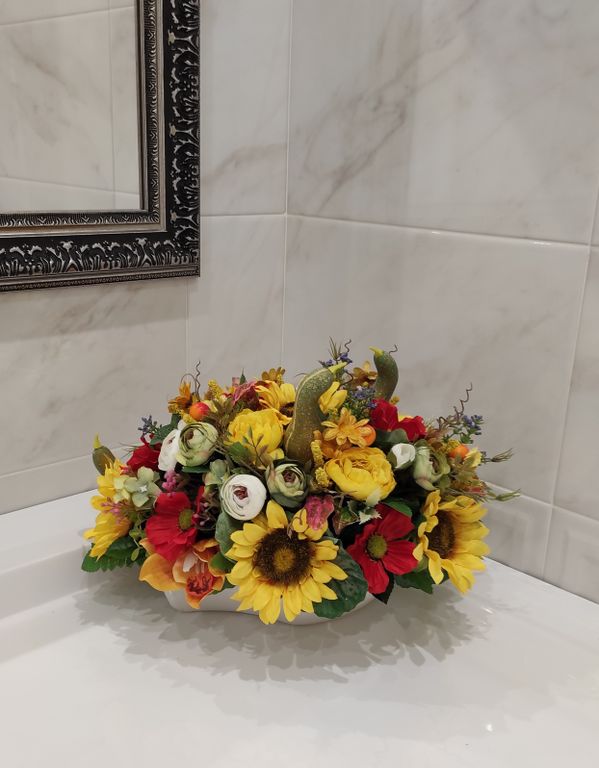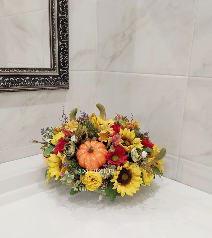 Композиция из цветов № ОФ006 Размер 35*25 см. Оригинальный осенний букет собран из подсолнухов, анимонов, крупной камелии, декоративных овощей. Композиция прекрасно дополнит и украсит ваш интерьер. Красивый и оригинальный подарок.