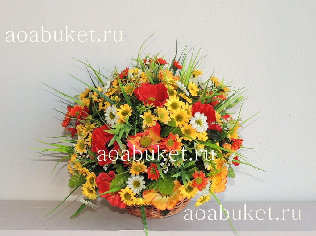 Композиция из искусственных цветов № М035 размер 30*30 см. цена р. Яркая композиция собрана из анемонов двух цветов, цветных ромашек, травки, папоротника. Осенняя композиция из искусственных цветов собрана в корзине .