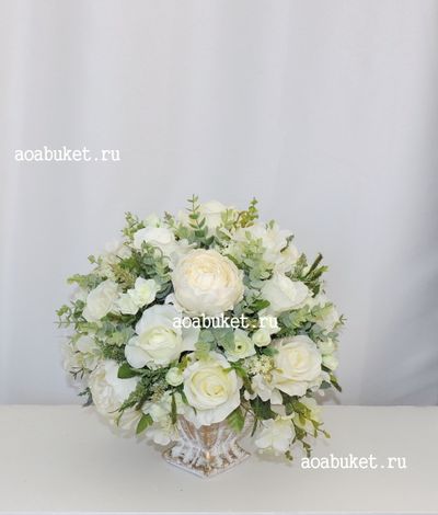Нежная белоснежная композиция собрана из фактурных пионов, роз, мини розочек, зелени эвкалипта, папоротника, декоративной зелени.