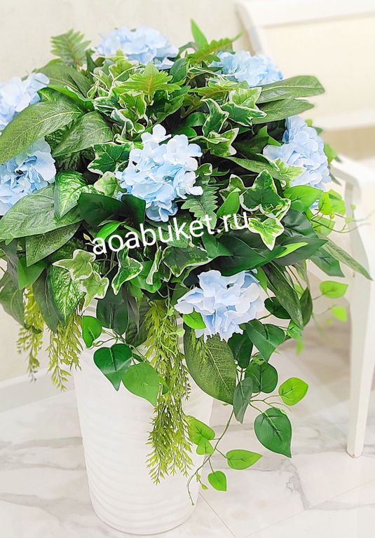 Напольная композиция из искусственных цветов для оформления сцены с голубой гортензией № НП030к