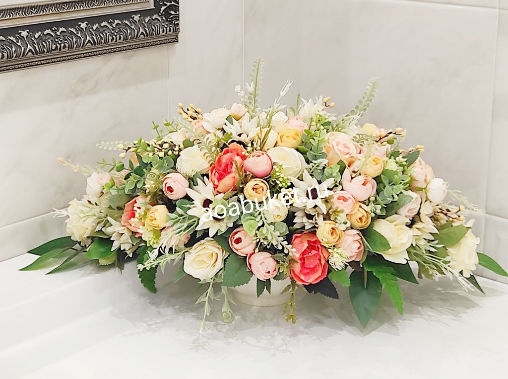 В сочной композиции собраны цветы роз, крупной камелии , тюльпанов, декоративной травки,мелкой камелии, флористической зелени. Букет собран в светло-золотистом кашпо из полистоуна ( искуственный камкнь).