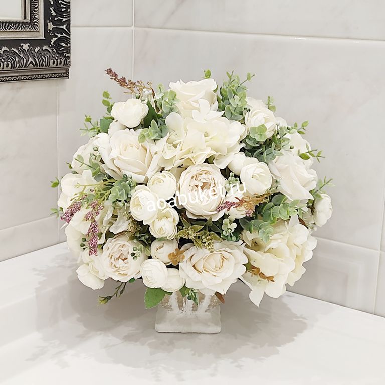 Нежная композиция из искусственных цветов составлена из роз молочного цвета, белой камелии, гортензии, флористической зелени.