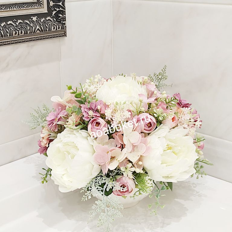 Композиция из искусственных цветов белых пионов с добавлением гортензии и камелии № МК005.