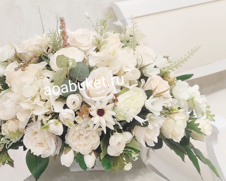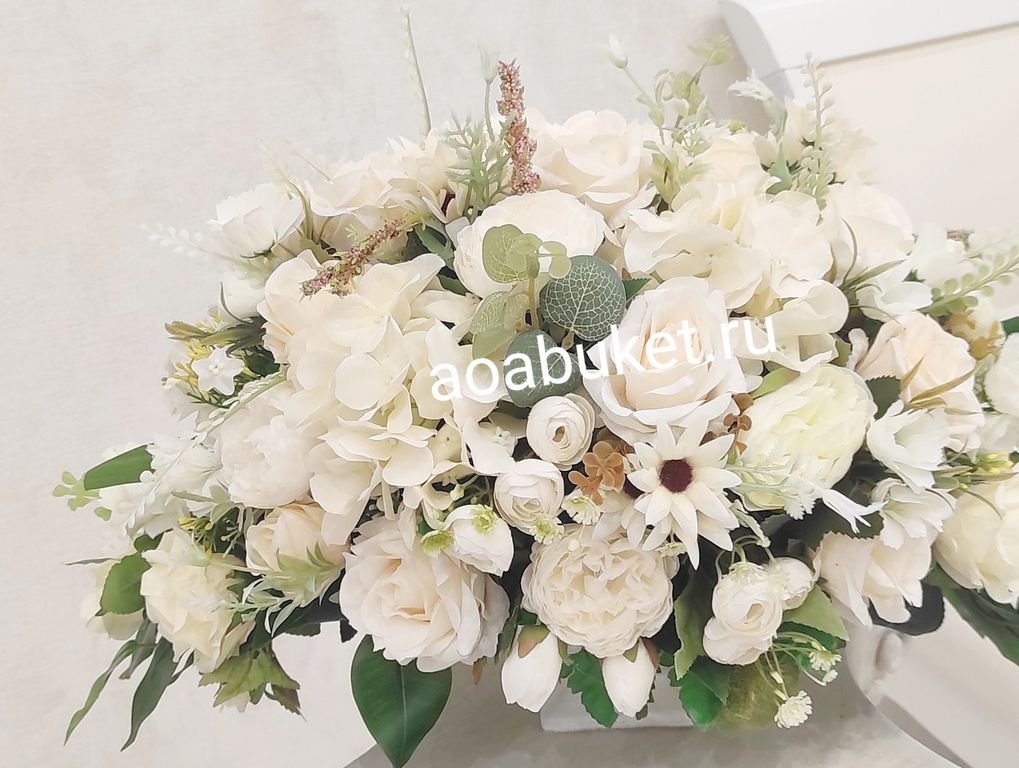 Удлинённая композиция из белых искусственных цветов в элегантной квадратной вазе — идеальное решение для вашего интерьера! В этом стильном ансамбле собраны изысканные сорта роз, ранункулюсы, пионовидные розы, зелень Бенджамина, веточки эвкалипта и флористическая зелень.