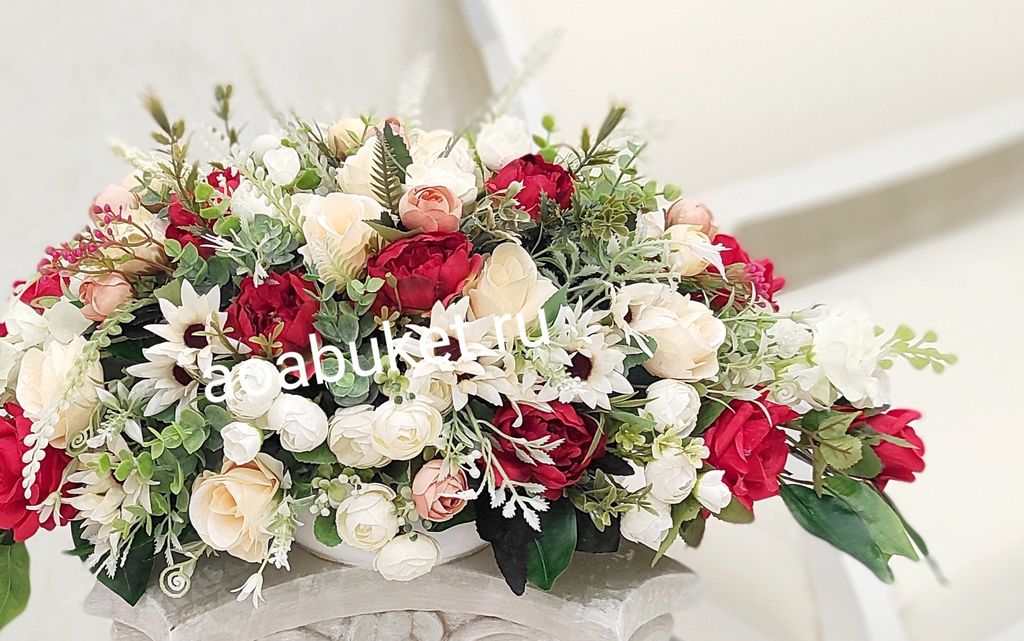 Представляем вам горизонтальную композицию из искусственных цветов “Мона Лиза” в бело-красных тонах. Композиция Мона Лиза преобразит любое пространство и станет его ярким акцентом.