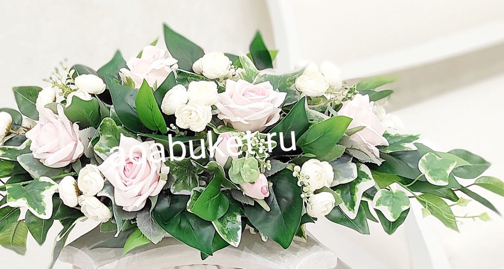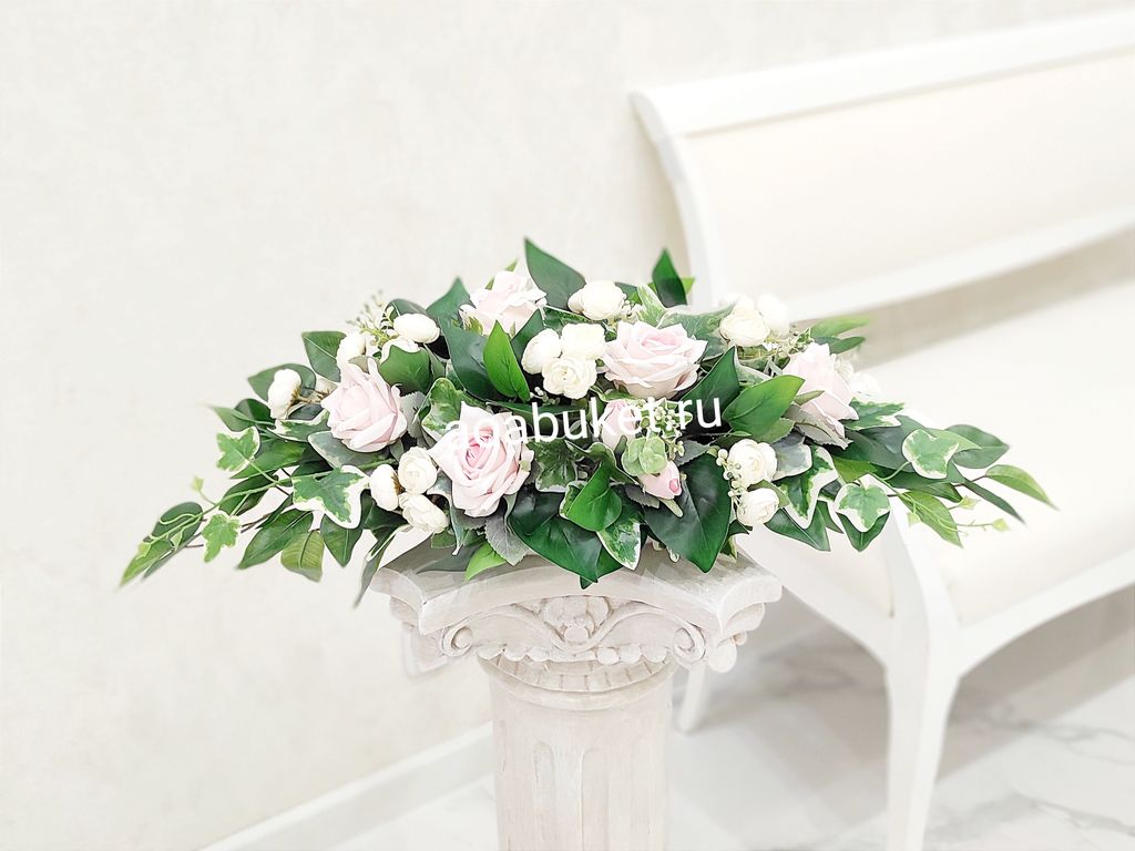 Уникальная горизонтальная композиция из искусственной зелени – идеальный выбор для стильного и современного оформления президиума, стола переговоров или каминной зоны. Небольшое добавление нежных розовых цветов придает этой композиции особую легкость и изысканность.