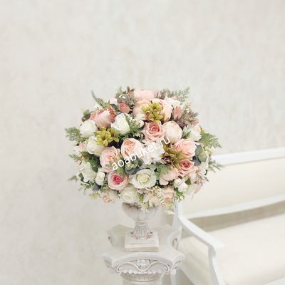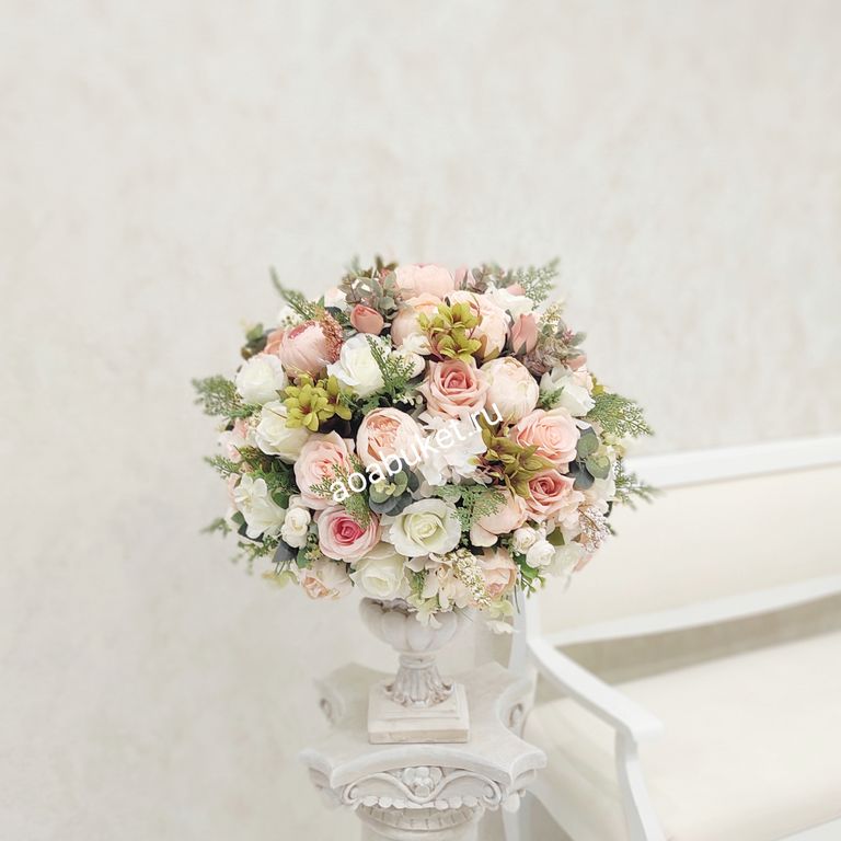 Цветовая гамма композиции основана на бежевых оттенках с акцентами в виде зеленых листьев и флористической зелени, что придает ей гармоничность и изысканность. Цветы расположены в круглой или овальной основе, в вазе или кашпо, что подчеркивает классический стиль композиции и добавляет ей устойчивости.