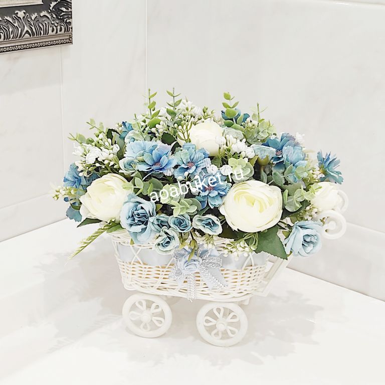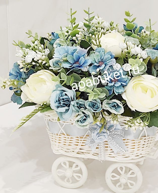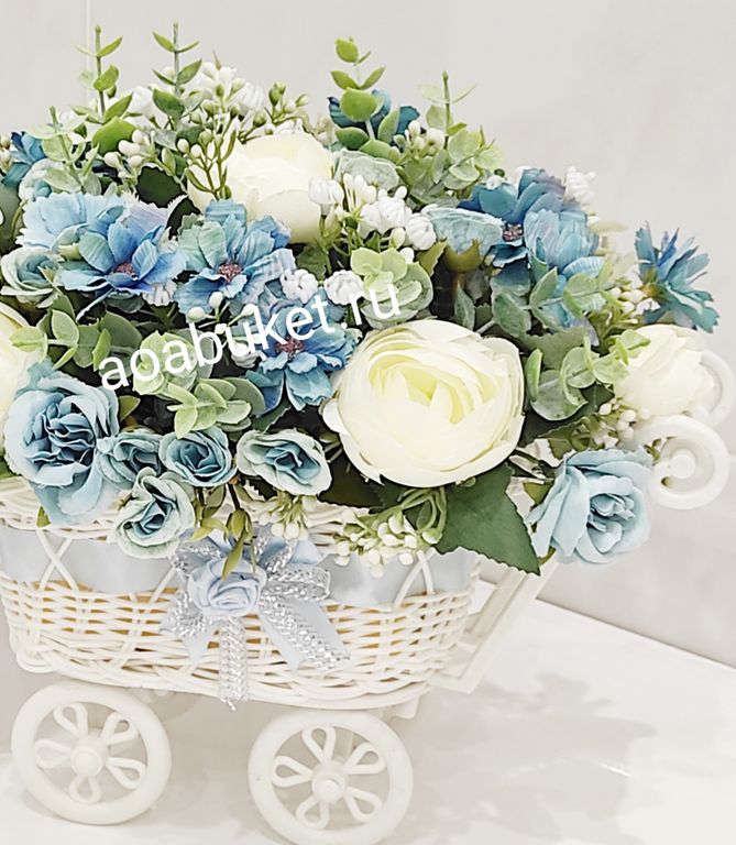 Композиция из искусственных цветов собрана в декоративной коляске.