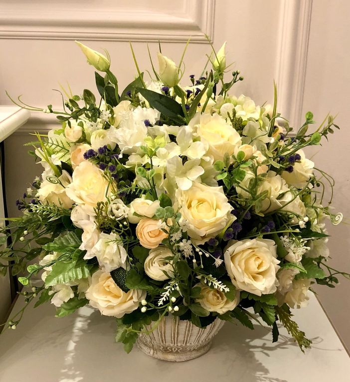 Композицию из искуственных цветов можно использовать для украшения интерьера гостинной, на стол, камин.