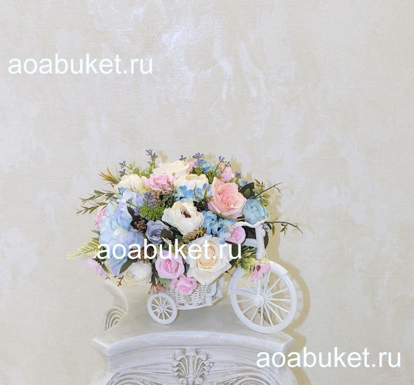 Композиция из искусственных цветов на велосипеде - голубая с белым и розовым № М011