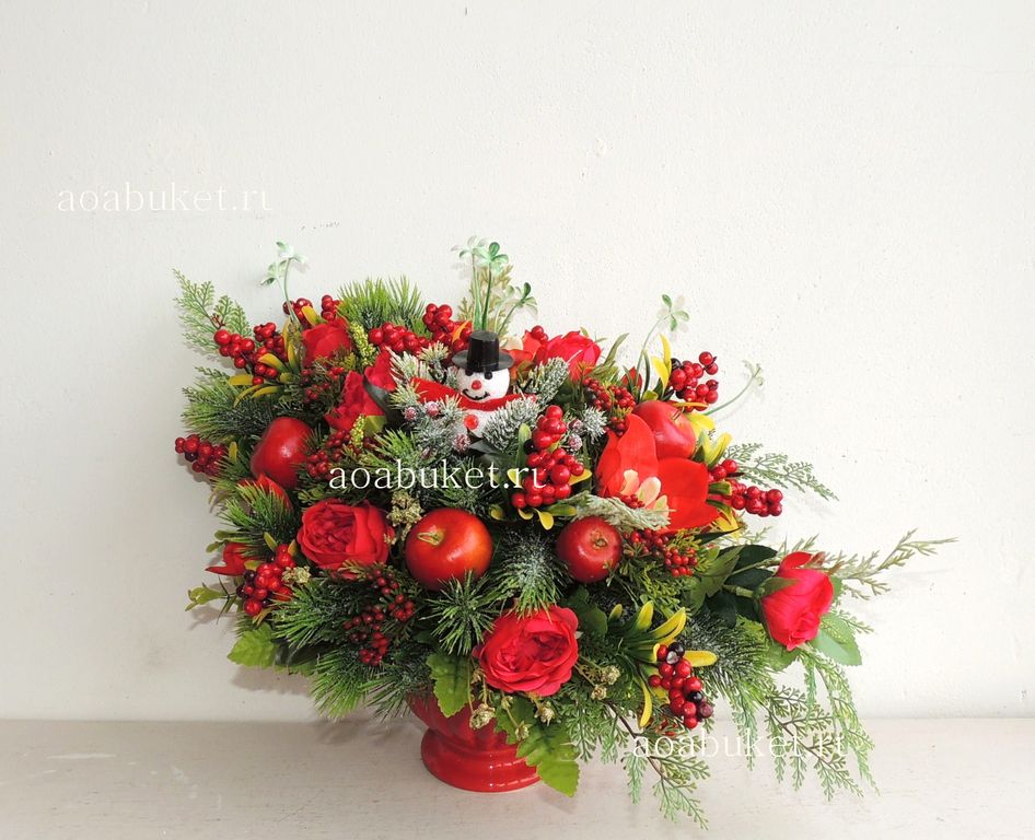 Новогодняя Композиция из искусственных цветов и еловых веток - Красавица № НГ003