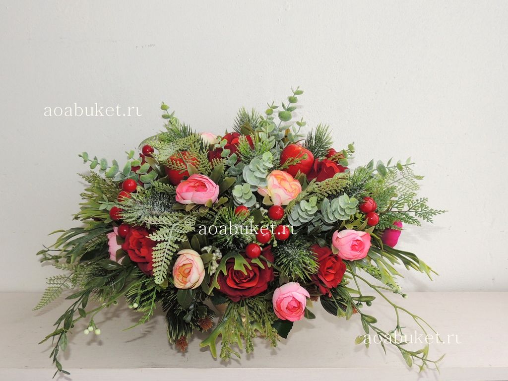 Композиция из искусственных цветов и еловых веток - Новогодний Каприз № НГ005 - Декорирование интерьера искусственными цветами