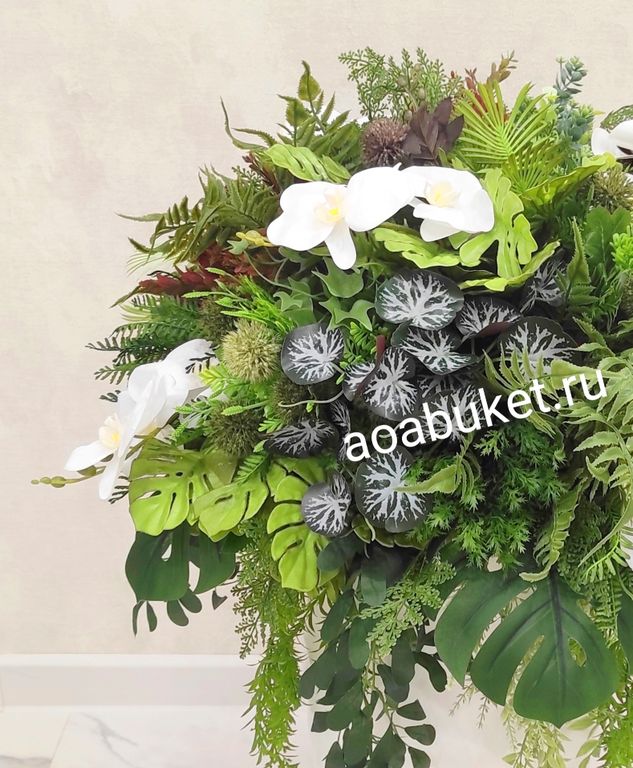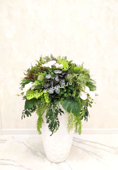 Уникальная Композиция из искусственной зелени, растений и цветов белой орхидеи № НП024к