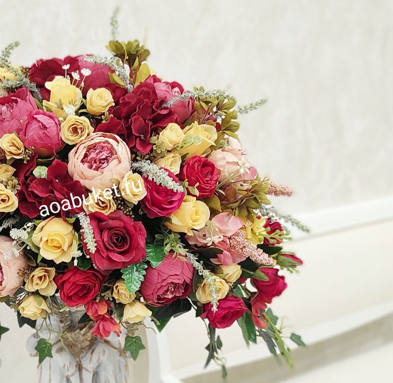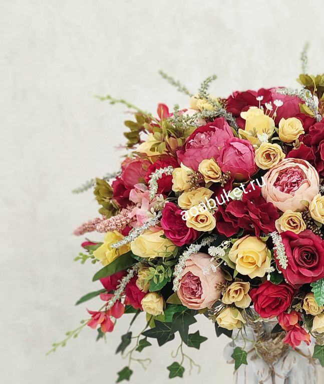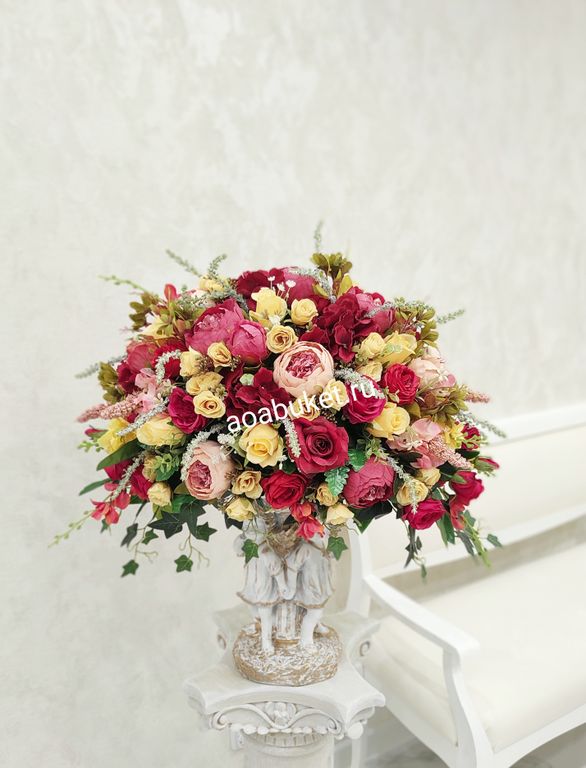 Композиция из искусственных цветов на статуэтке двух ангелочков Превосходство Алое № АР48