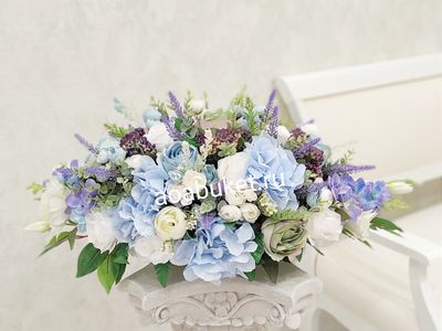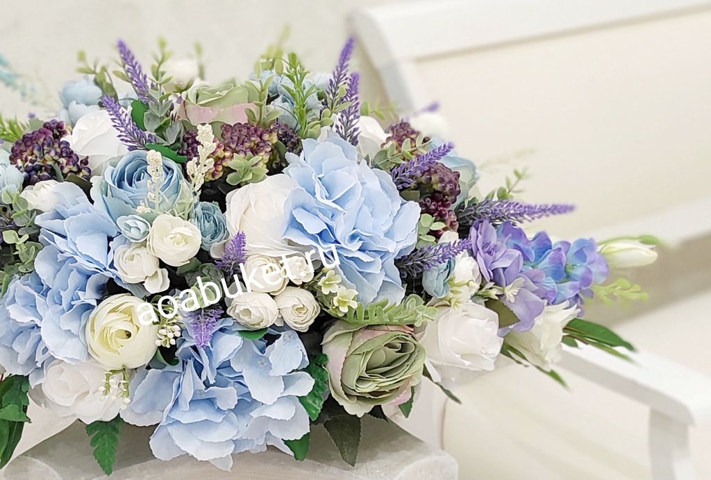 Все цветы выполнены с большим мастерством, чтобы создать неповторимый вид, который будет радовать глаза на протяжении многих лет. Белые и синие оттенки придают букету изящность и стиль.