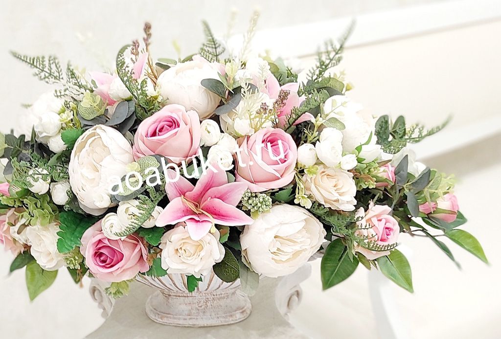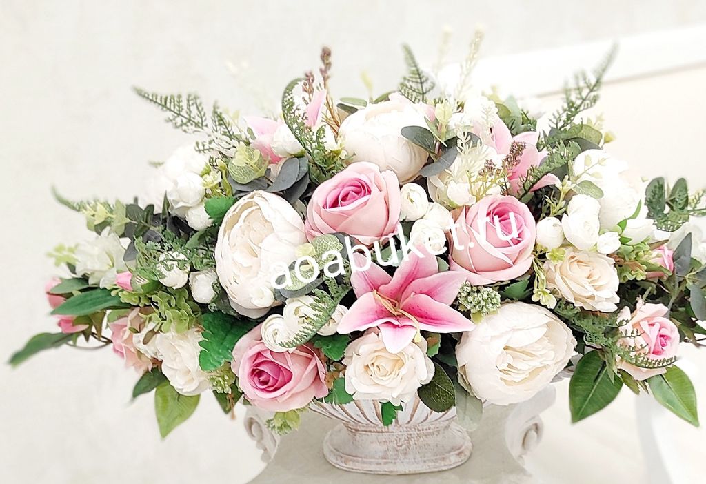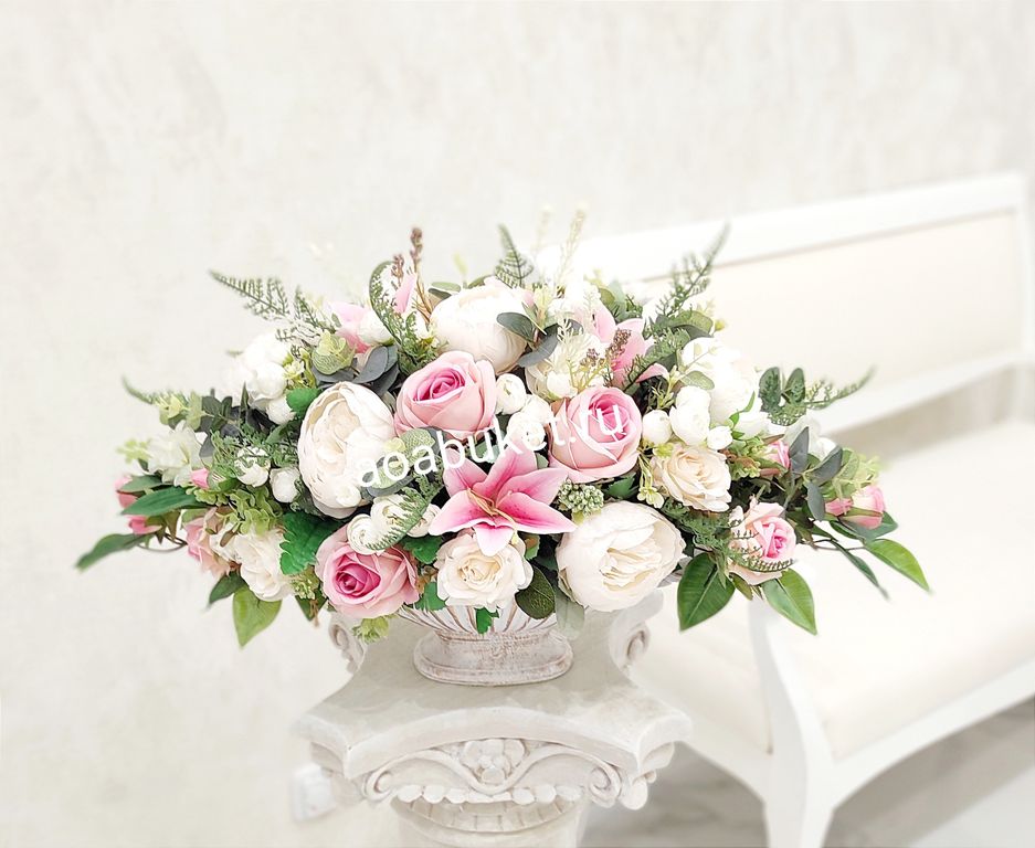 Композиция из искусственных цветов, выполненна в нежно-розовых тонах.