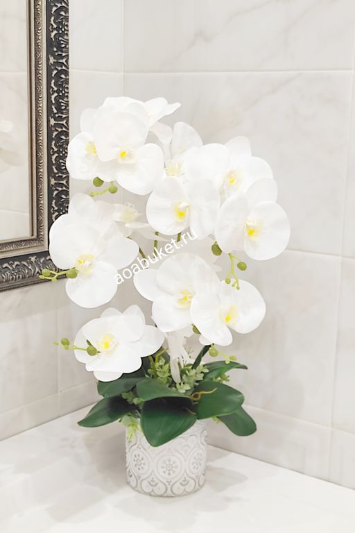 КОМПОЗИЦИЯ ИЗ ИСКУССТВЕННЫХ ЦВЕТОВ ОРХИДЕИ ВАЗА БЕЛАЯ УЗОР СЕРЕБРОМ МАЛАЯ № ОРO31.
